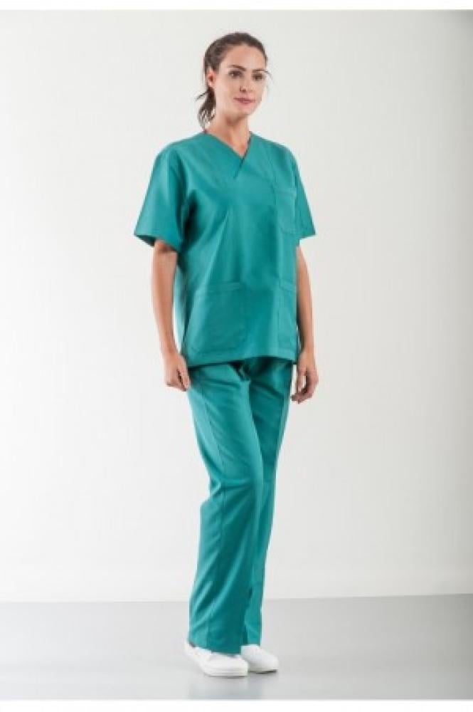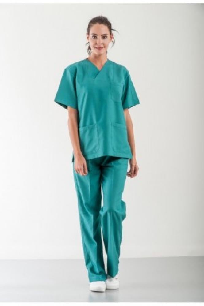 تأتي البلوزة بفتحة رقبة على شكل حرف V - وثلاثة جيوب انيقة وعملية بنفس الوقت - كما يحتوي البنطال على جيوب جانبية مخفية وجيب خلفي.